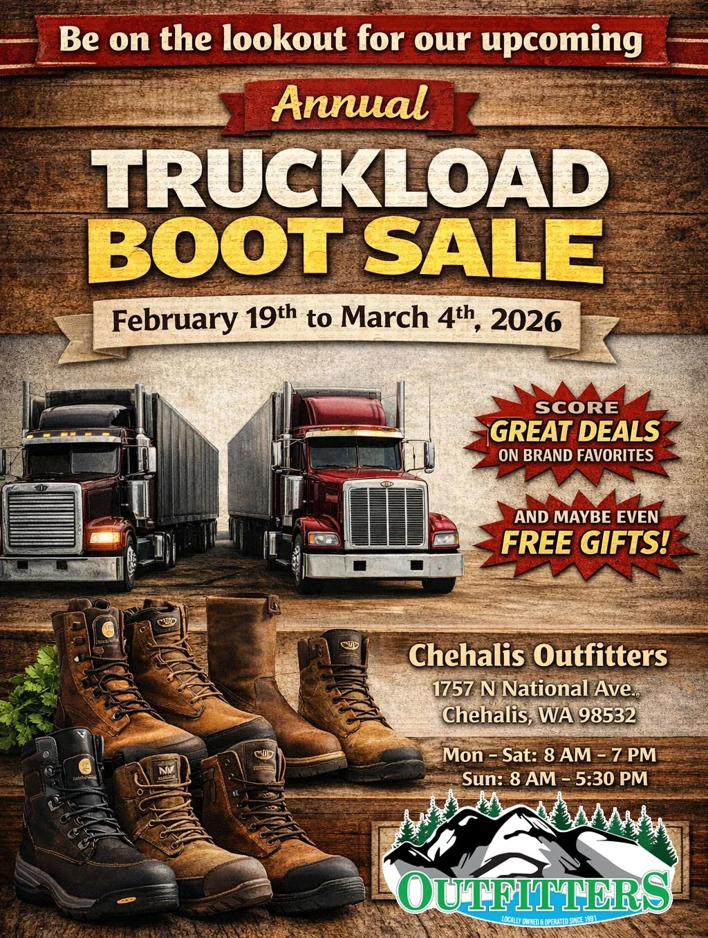Our Annual TRUCKLOAD BOOT SALE is rolling into Chehalis Outfitters!