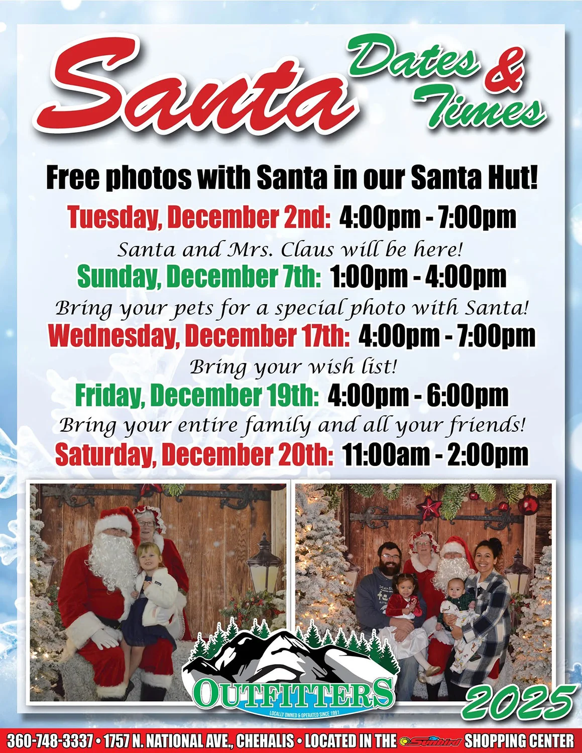 Free Santa Photos in Chehalis Date Dec 20 2025 Expired! Time 1:00 pm - 4:00 pm Labels Event Location Chehalis Outfitters 1757 N National Ave, Chehalis, WA 98532 Category Celebration Share this event